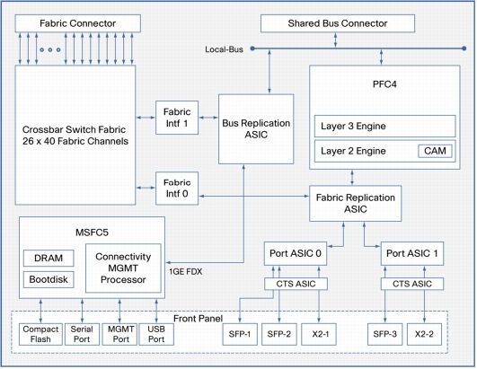 This diagram from Cisco shows the hardware layout of the Sup2T, focusing on all the major junction points a packet or frame could crossed through depending on ingress point, required processing, and egress point.